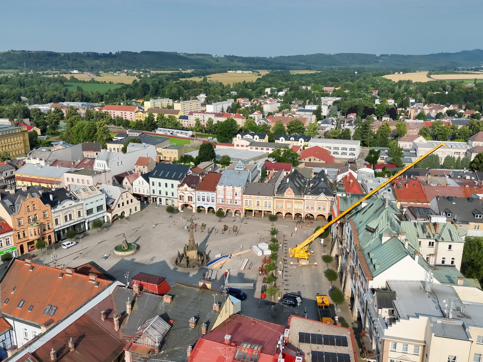 Na náměstí ve Dvoře Králové dorazil 120tunový jeřáb. Pomáhá se stropní konstrukcí čp. 2jerab nam TGM 15 7 2025 dvur celkove lukas maly.JPG
